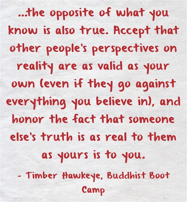 “The opposite of what you know is also true to somebody else, somewhere else, because of their time, place, or circumstances. The opposite of what I know is truth for someone else.”
