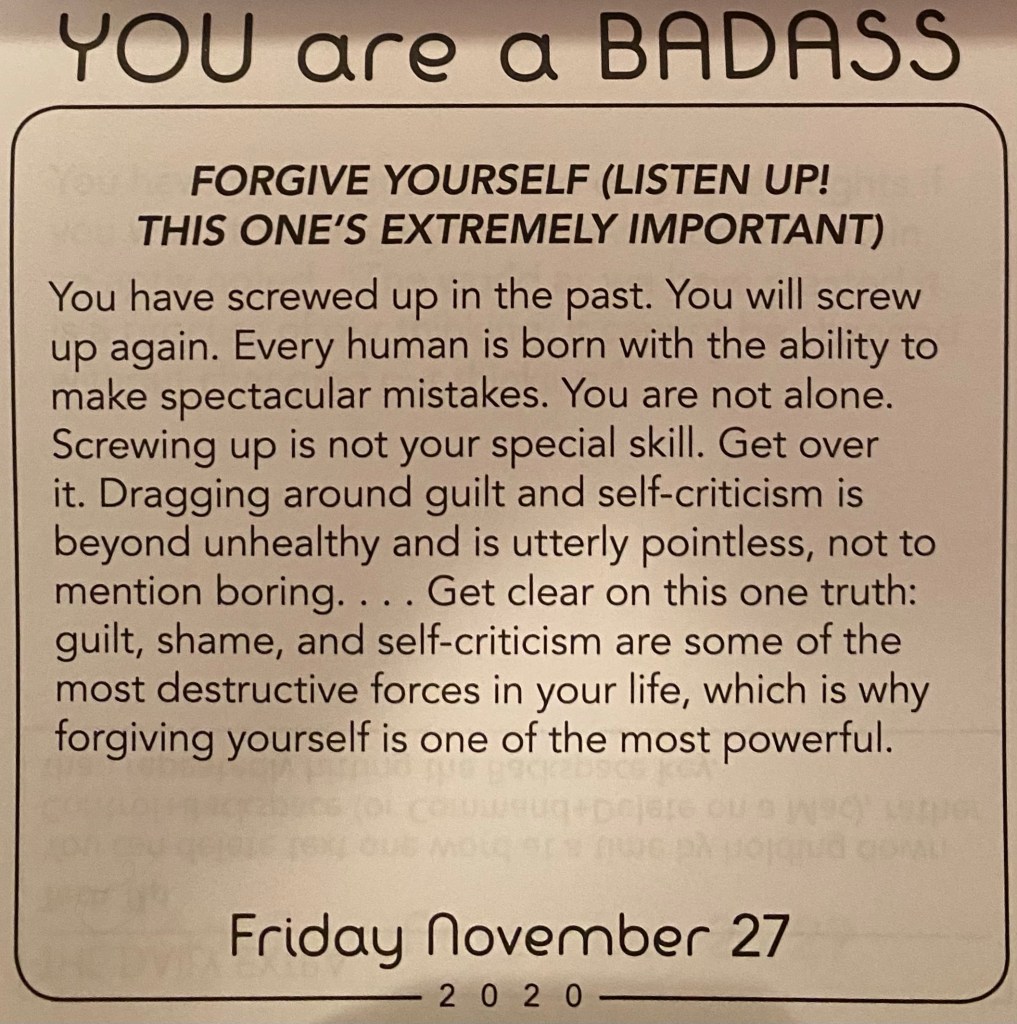 However, I am much better in the “forgiving myself” and “letting go of guilt, shame, and self-criticism” departments these days!