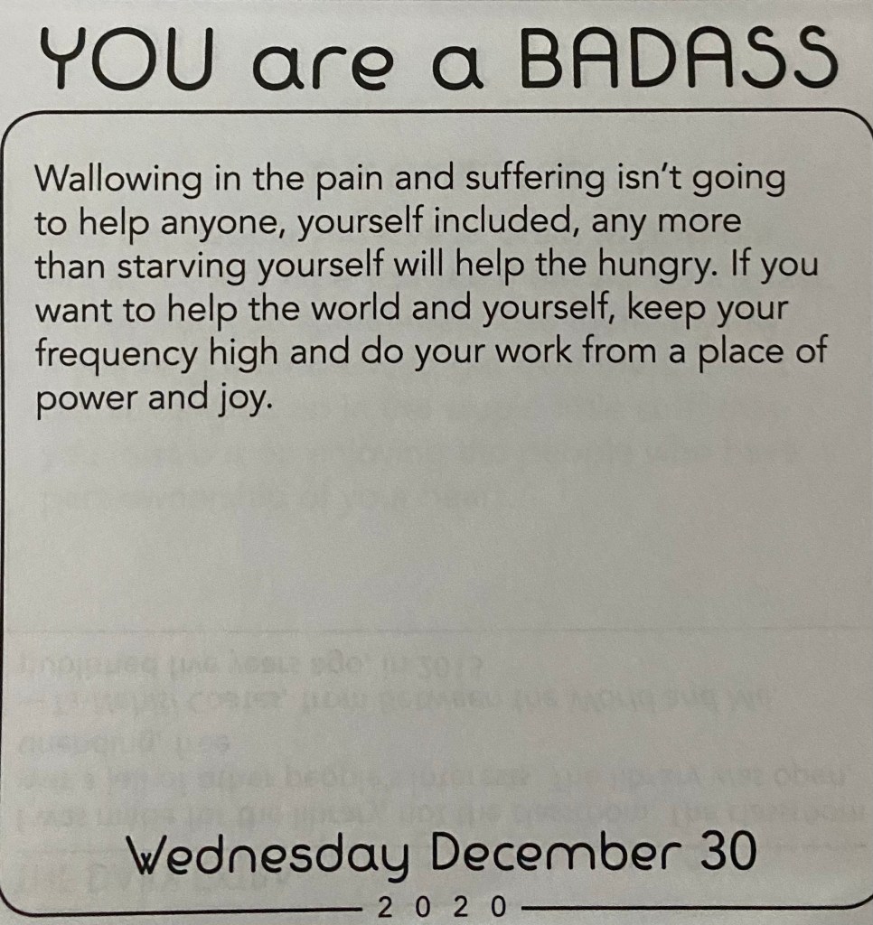 But I am sure that you will agree, little badass calendar, that making broad sweeping statements about keeping one’s frequency high and doing work from a place of power and joy isn’t really good advice while facing the death of a loved one, trauma, or the jagged edge of the abyss.