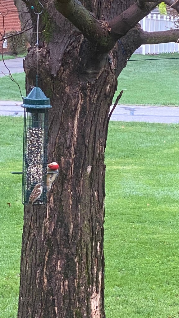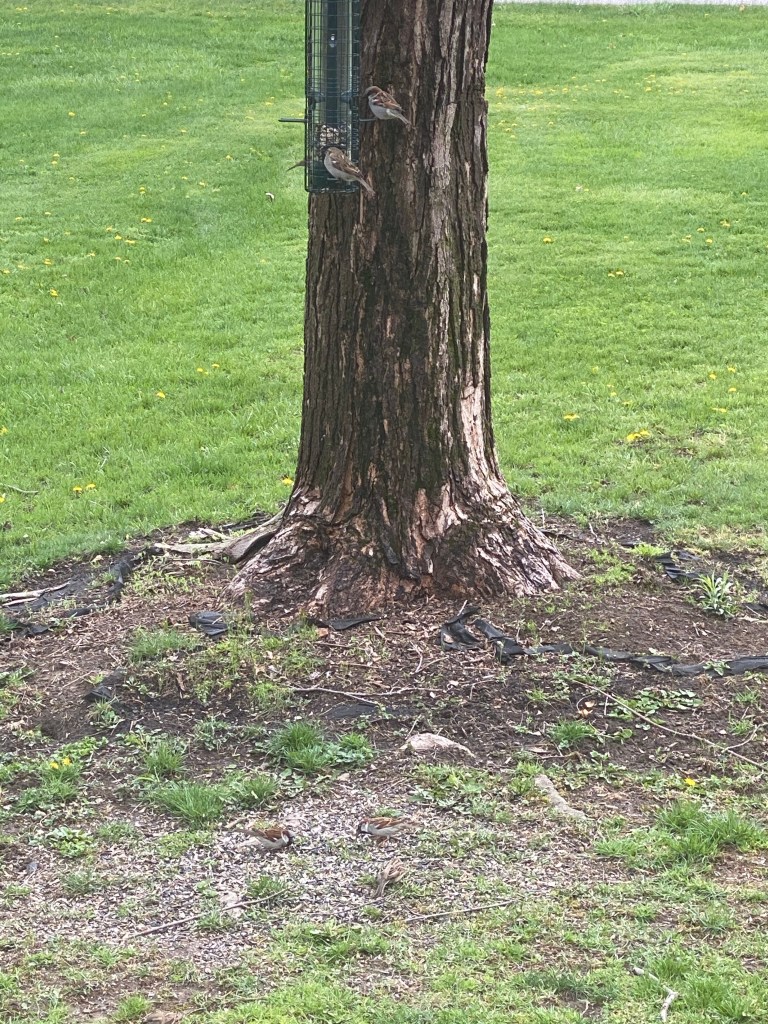 The other front yard birds are hiding in the bushes chirping so loudly that I can hear them in the house. I imagine that they are complaining that the free food supply has dwindled for today.