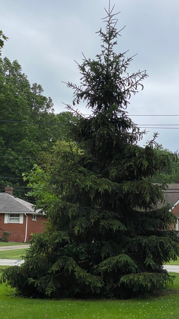 There is a huge pine tree in my front yard.