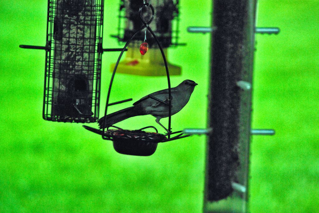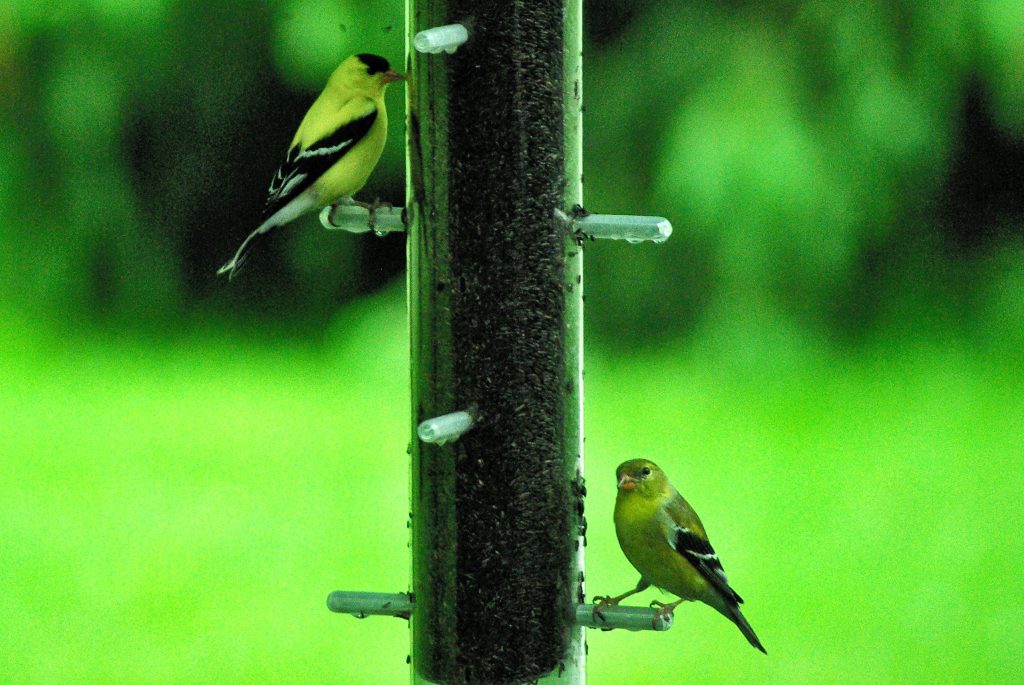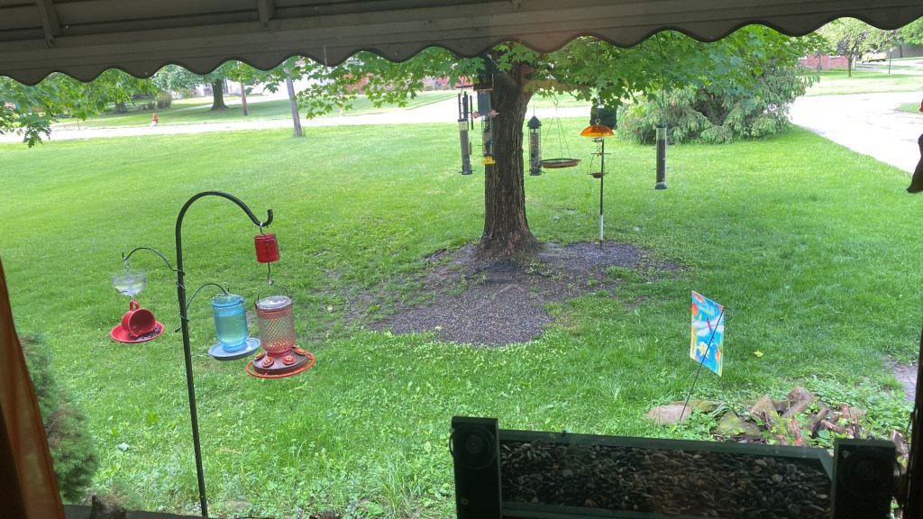 Near the window is a hummingbird feeder and a new addition last night – a green window feeder made from recycled plastic.
