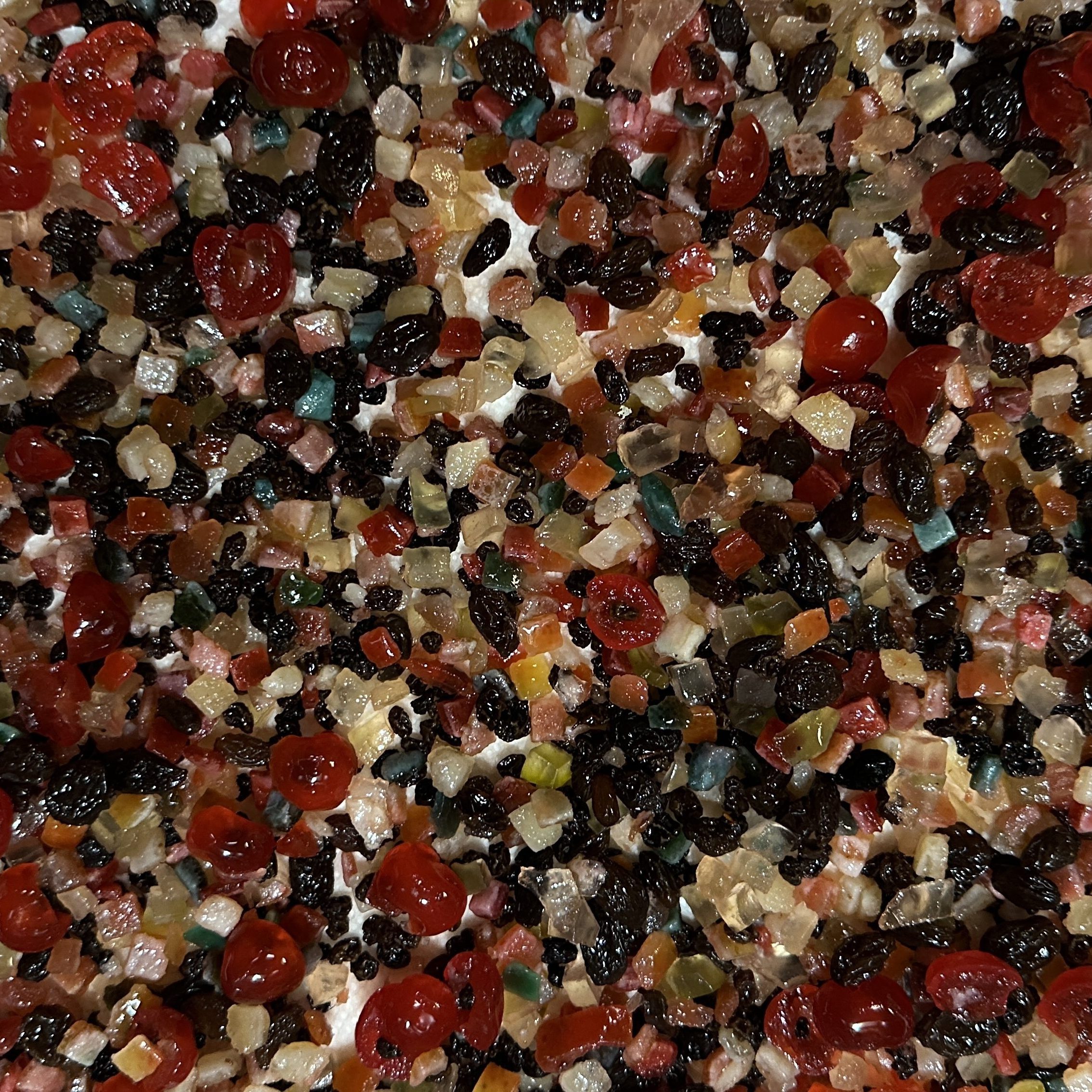 Combine the raisins, currants, candied citrus peel, angelica, and cherries in a bowl. Pour the Rum over the preceding mixture, tossing the fruit about to coat the pieces evenly. Soak at least one hour.