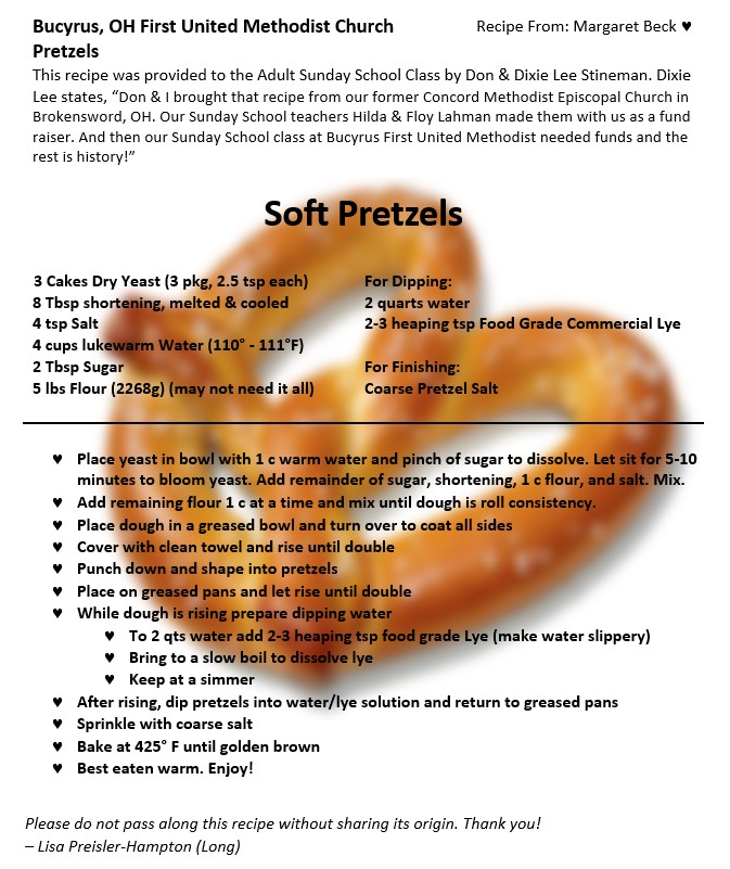 Then the icing on the pretzel – one of my parent’s friends shared the provenance of the recipe! Dixie Lee Stineman wrote, “Don & I brought that recipe from our former Concord Methodist Episcopal Church in Brokensword, OH. Our Sunday School teachers Hilda & Floy Lahman made them with us as a fund raiser. And then our Sunday School class at Bucyrus First United Methodist needed funds and the rest is history!”